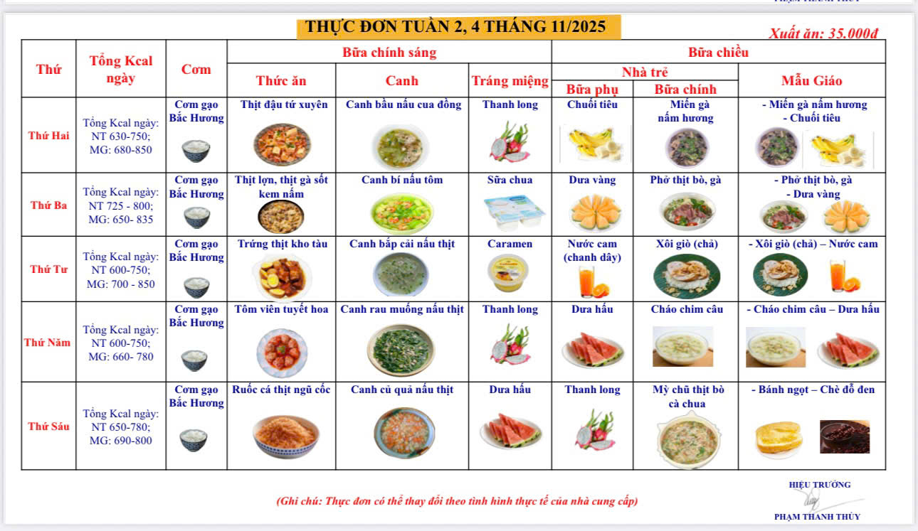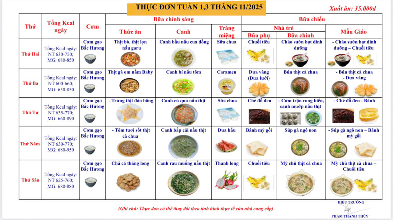 Thực đơn tháng 10/2025 tại Trường Mầm non X20 được xây dựng khoa học – cân đối – phong phú, luân phiên theo tuần 1,3 và tuần 2,4.