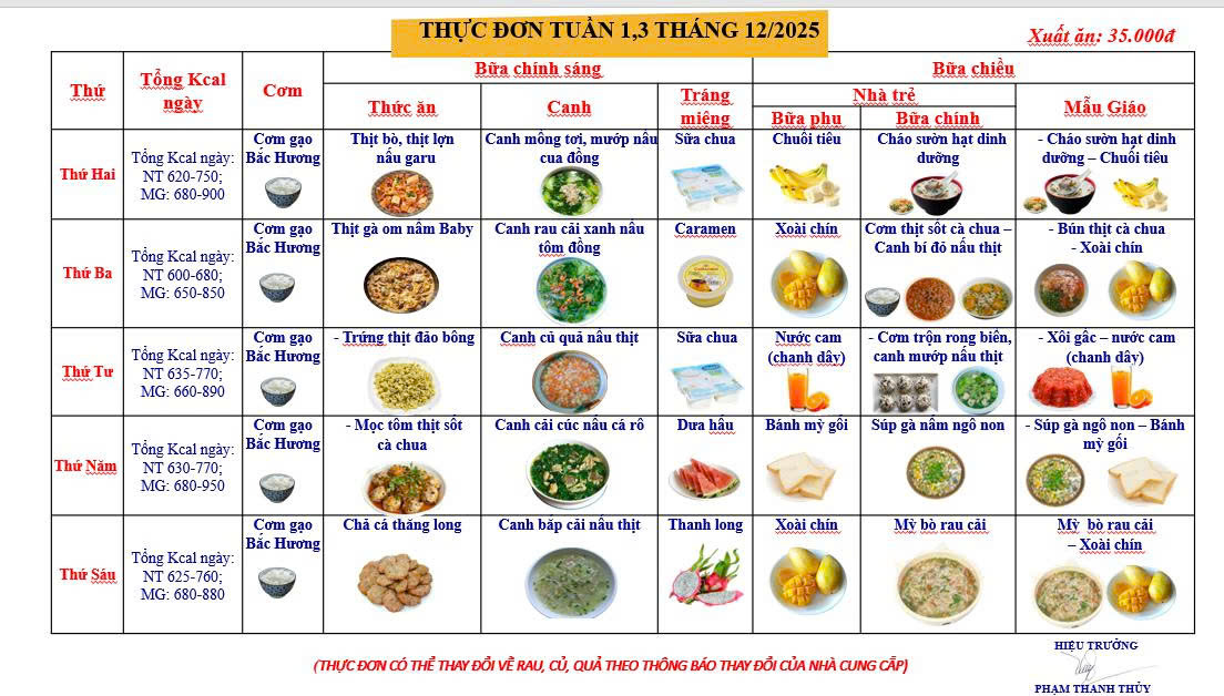 Thực đơn tháng 12/2025 tại Trường Mầm non X20 được xây dựng khoa học – cân đối – phong phú, luân phiên theo tuần 1,3 và tuần 2,4.