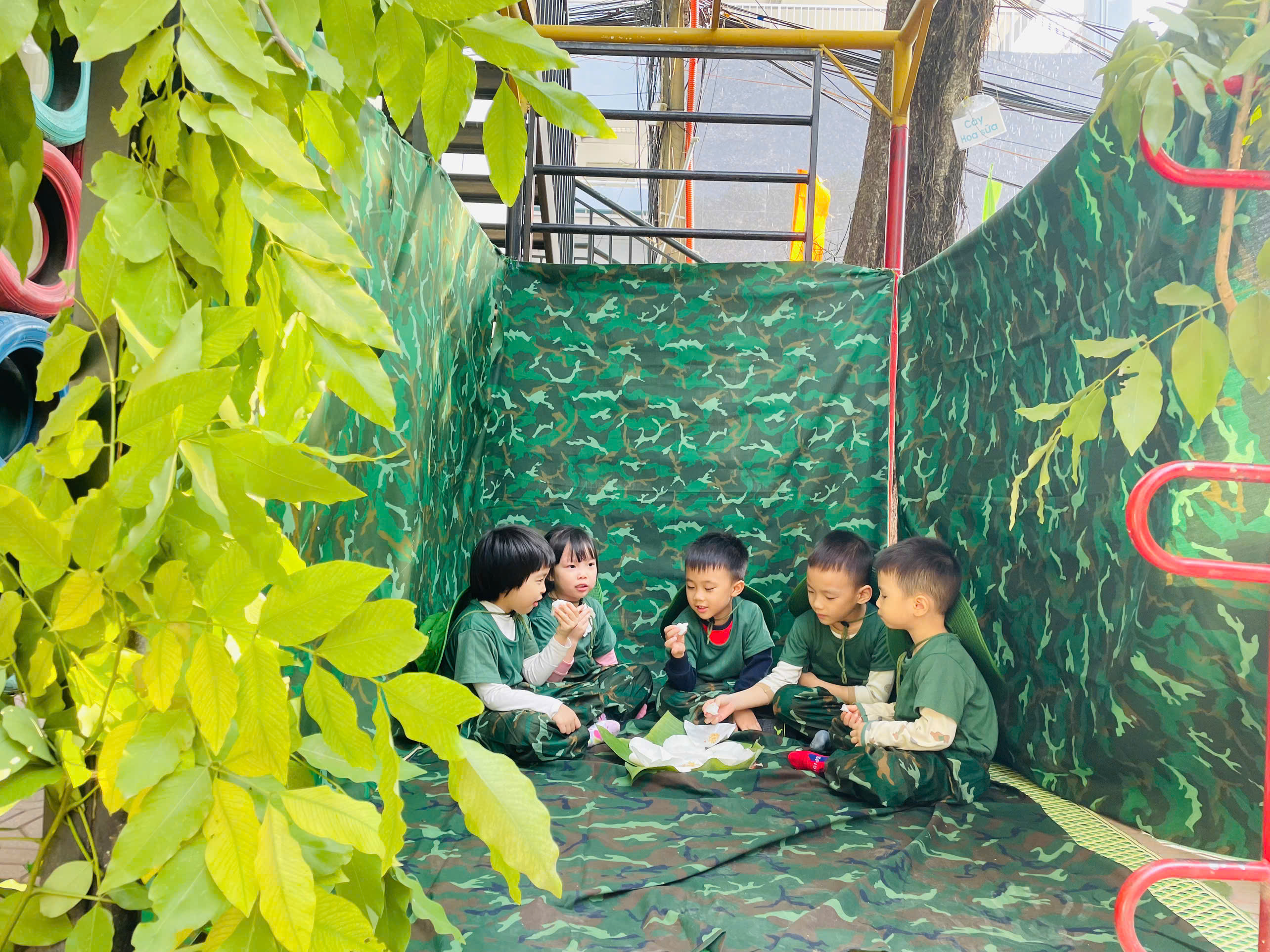 Để giúp các con có buổi trải nghiệm thật ý nghĩa, các cô đã chuẩn bị rất nhiều các nguyên vật liệu khác nhau như lá cây, lá chuối, tàu lá chuối... để trẻ làm súng, nguỵ trang... rèn luyện các thao tác, kỹ năng và sự khéo léo đôi tay của trẻ.