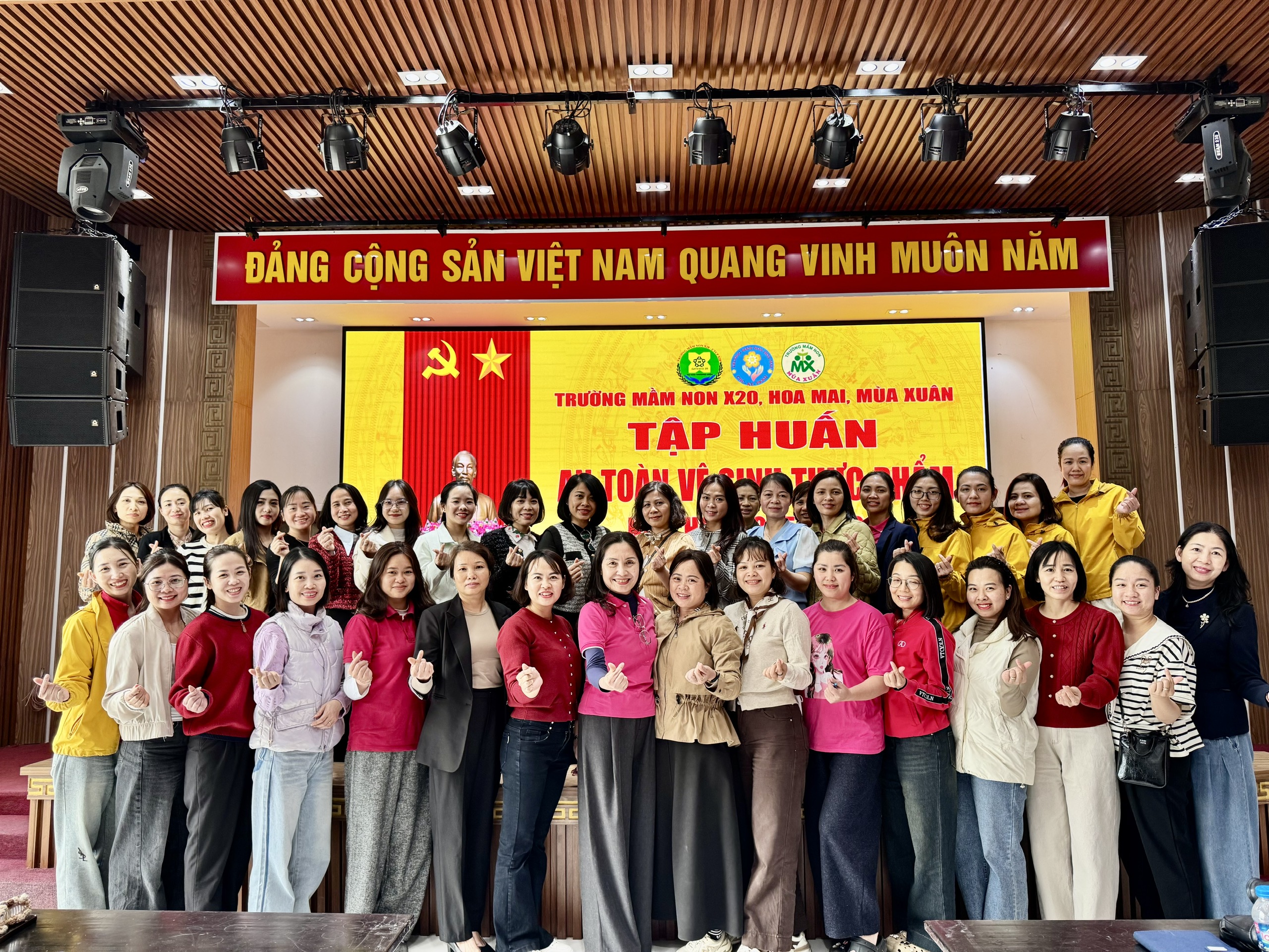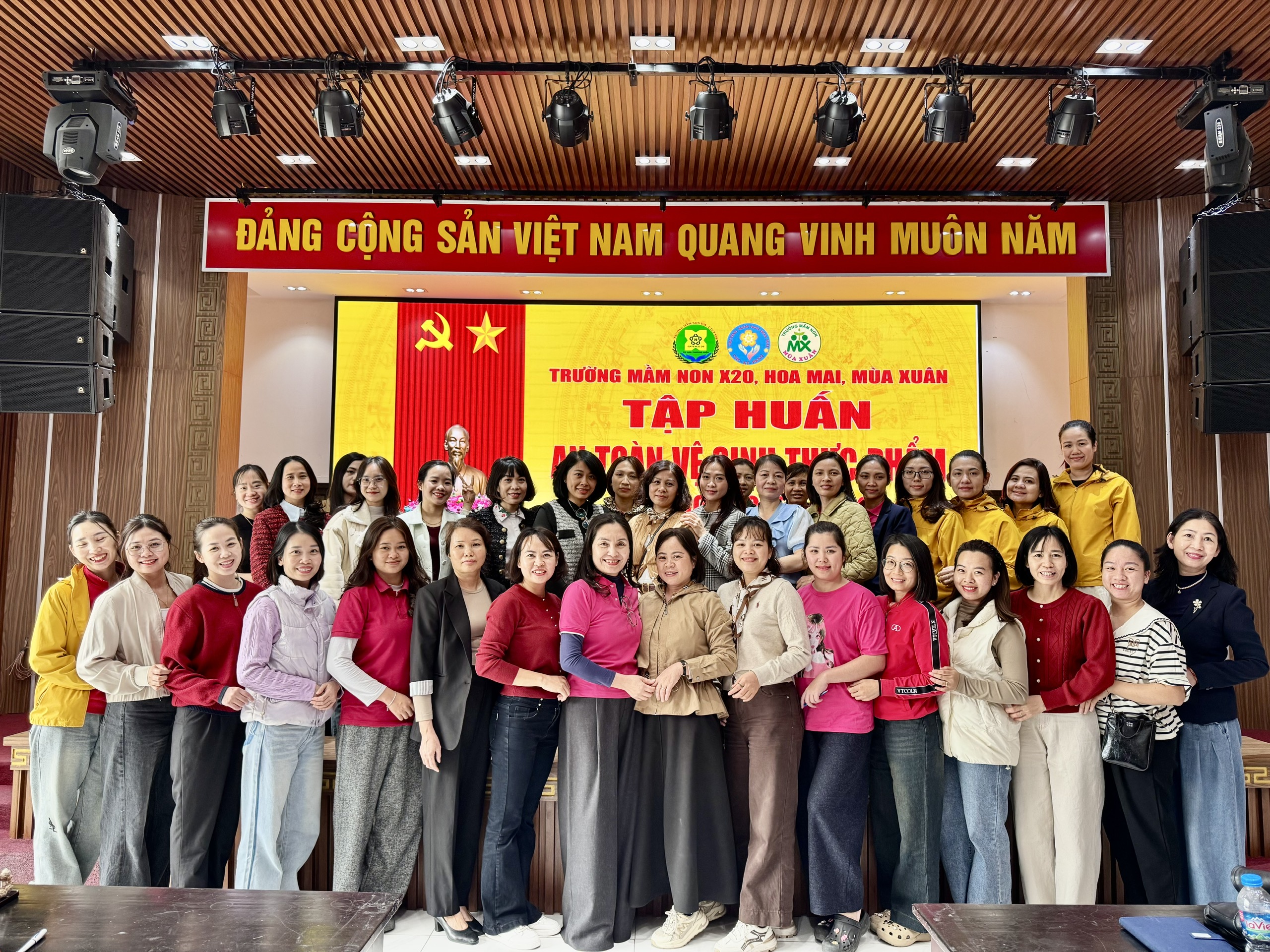 Nhằm nâng cao kiến thức và kỹ năng đảm bảo an toàn vệ sinh thực phẩm trong công tác chăm sóc, nuôi dưỡng trẻ, Trường Mầm non X20 đã phối hợp cùng Trường Mầm non Hoa Mai và Trường Mầm non Mùa Xuân tổ chức chương trình tập huấn kiến thức An toàn vệ sinh thực phẩm cho đội ngũ cán bộ, giáo viên, nhân viên của ba nhà trường.