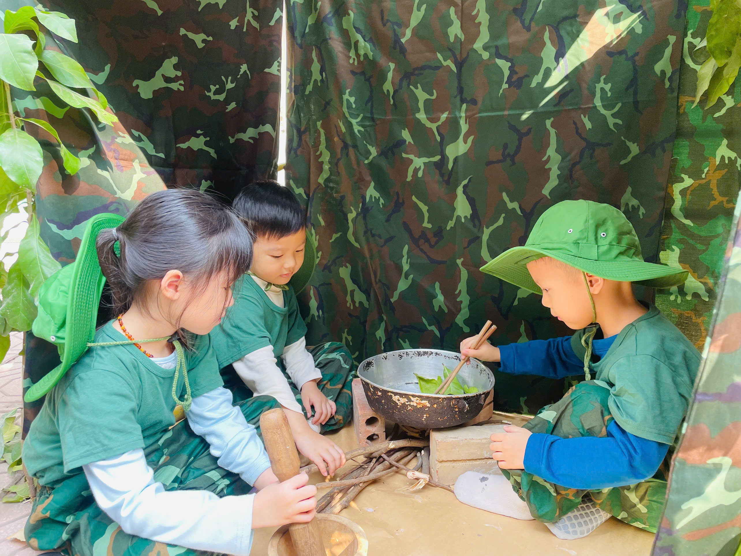 Để giúp các con có buổi trải nghiệm thật ý nghĩa, các cô đã chuẩn bị rất nhiều các nguyên vật liệu khác nhau như lá cây, lá chuối, tàu lá chuối... để trẻ làm súng, nguỵ trang... rèn luyện các thao tác, kỹ năng và sự khéo léo đôi tay của trẻ.