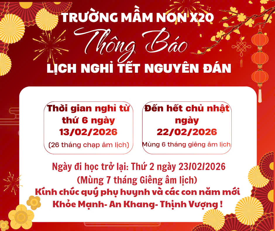 Kính gửi: Quý Phụ huynh học sinh, Trường Mầm non X20 trân trọng thông báo đến Quý Phụ huynh lịch nghỉ Tết Nguyên Đán năm 2026 của nhà trường như sau: