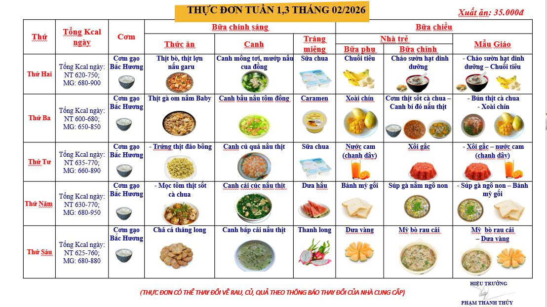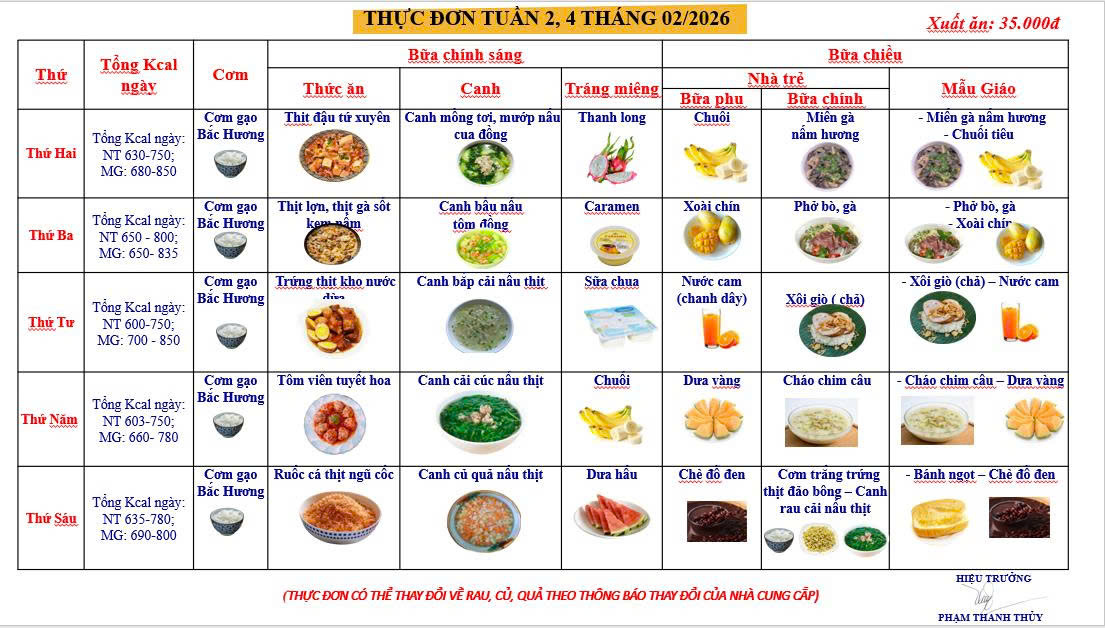 Thực đơn tháng 02/2026 tại Trường Mầm non X20 được xây dựng khoa học – cân đối – phong phú, luân phiên theo tuần 1,3 và tuần 2,4.